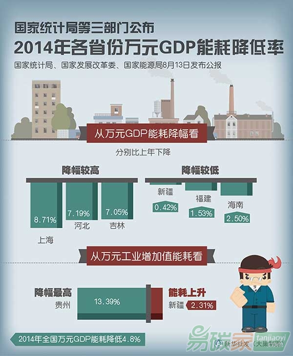 國家統計局、國家發展改革委、國家能源局8月13日發布公報,公布了2014年各省區市萬元地區生產總值(GDP)能耗降低率等指標。