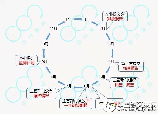 第三方機構建立一個常規的報送核查流程,保障配額的真實有效。碳交易流程如下圖所示,其中報送核查工作占了很大比重(圖中時間節點僅為舉例,實際以政府公文為準):