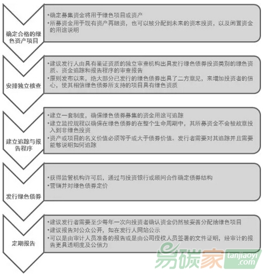 由多家投資銀行聯合制定的綠色債券原則,目前已移交國際資本協會(ICMA)來管理指導方針的后續監測及改進。綠色債券原則是一套綠色債券發行程序的自愿性指引原則,旨在保障綠色債券市場的交易透明度和良好的信息披露程度,而“綠色”的具體定義由發行方來決定。綠色債券原則由以下四個重要部分組成:資金用途、項目評估和篩選、資金管理和報告。根據綠色債券原則,發行綠色債券的流程如下圖所示: