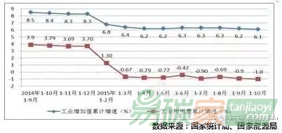 2015年1-10月,全國規模以上工業增加值同比增長6.1%,增速比上年同期回落2.3個百分點,比上半年回落0.2個百分點。部分高載能行業生產下滑明顯,粗鋼、生鐵、