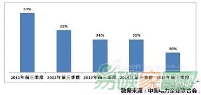 有色等四大高載能行業能源消費量占全社會的比重一直保持下降態勢(圖3);2015年前三季度,四大行業用電量占全社會用電總量的比重約為30%,比去年同期下降了1個百分點。