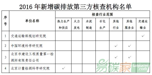北京市2016年新增碳排放第三方核查機(jī)構(gòu)名單