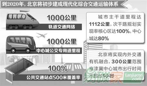 北京市交通委委員容軍介紹,2020年,北京將擁有公共交通快速通勤系統,形成1000公里的軌道交通網絡,中心城公交專用道里程達1000公里,公共交通站點500米覆蓋率達到100%。道路網功能不斷完善,承載能力大幅度提升,城市快速路總里程達461公里,城市主干道里程達1112公里,次干路規劃實現率核心區達100%,中心城達80%。打造地鐵、市郊鐵路、地面公交、小汽車組成的“1小時城市交通圈”,形成高品質的大都市區交通體系。打造安全、便捷、舒適、宜人的步行和自行車出行環境,形成“1刻鐘生活圈”。