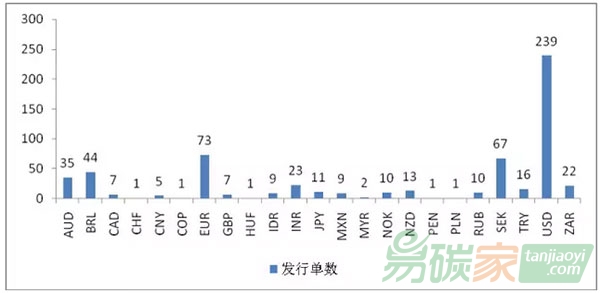 從發行的計價幣種來看,主要以美元為主,以美元發行的綠色債券共計239單,占全部綠色債券的39.37%,發行規模達到407.95億美元;發行單數第二多的為以歐元計價的綠色債券,共發行73單,占比為12.03%,發行規模為305.40億歐元。