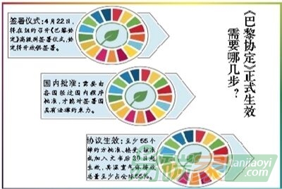 協定生效的前提是由至少55個締約方批準、接受、核準或加入氣候公約并向聯合國提交文書,同時這些締約方的溫室氣體排放總量至少占全球碳排放總量的55%。協定從2016年4月22日起開放簽署,為期一年。
