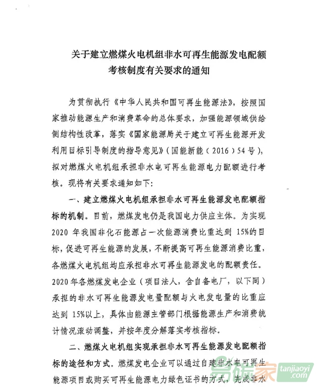 這份名為《關于建立燃煤火電機組非水可再生能源發電配額考核制度有關要求的通知》為國家能源局起草,還沒有正式作為文件公布并執行,但國家能源局要求5月3日前,國家電網、華能、大唐、華電、國電、國家電投等重量級電企迅速給出回應。如果不將意見反饋至國家能源局,將視為無不同意見。