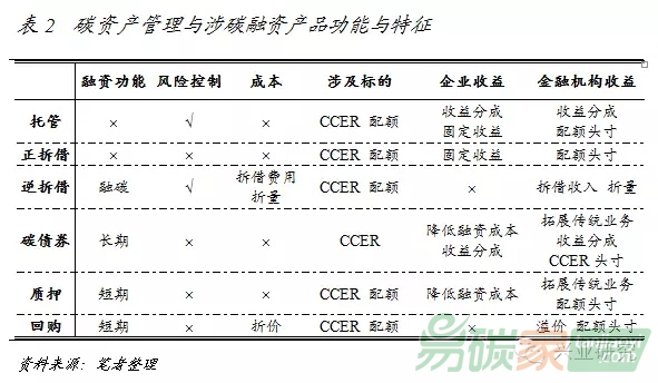 碳資產管理與涉碳融資各類業務的基本功能,以及對于控排企業和金融機構的影響,如下表所示。