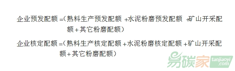 水泥生產企業(yè)配額計算按照生產工序分為四個部分:熟料生產、水泥粉磨、礦山開采和其它粉磨,配額為本企業(yè)各生產工序配額之和。其中,熟料生產、水泥粉磨采用基準法分配,礦山開采、其它粉磨采用歷史法分配,計算公式如下: