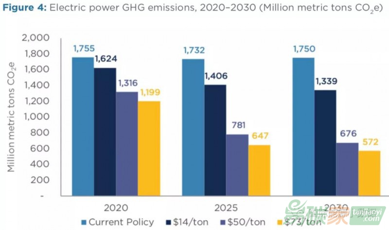 第一,碳稅有助于減排,但是需要達到較高的碳價水平才能充分發(fā)揮作用。如果碳稅達到50美元/噸的時候,美國2025年代