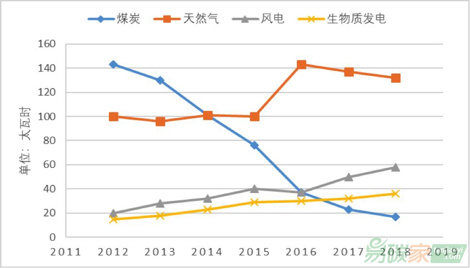 從下圖1可以看出,自2013年英國實行碳稅以來,對煤電廠的沖擊巨大,燃煤發電量降速明顯。而排放較低的天然氣發電以及風力和生物質等清潔能源發電卻在碳稅的作用下迎來快速增長,尤其是天然氣發電,在2014年以后取代煤電,成為了英國電力供應最主要的燃料,同時風力發電從2012年的20太瓦時增至2018年的58太瓦時,增幅近2倍。2017年后,風力發電、生物質能發電體量均已經超過煤電。