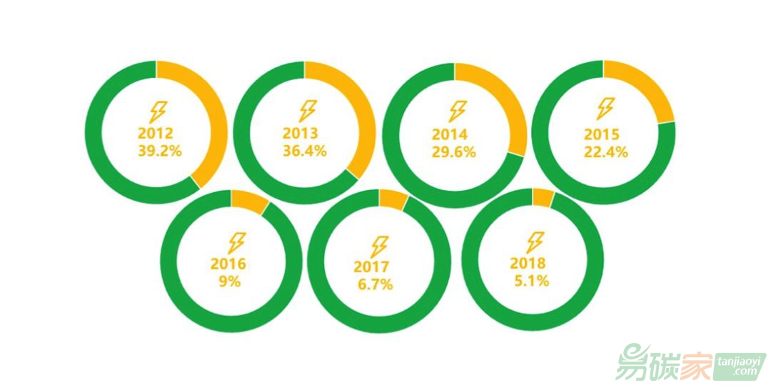 英國煤電在碳稅的影響下規模不斷縮減,電力系統對煤電的依賴程度也逐漸降低。英國政府已宣布將在2025年前淘汰所有煤電廠。如圖2所示,煤電供給比從2012年的近4成(39.2%)一路降至2018年的5.1%,逐步從電力供給巨頭演變為電力系統中很小的一部分。