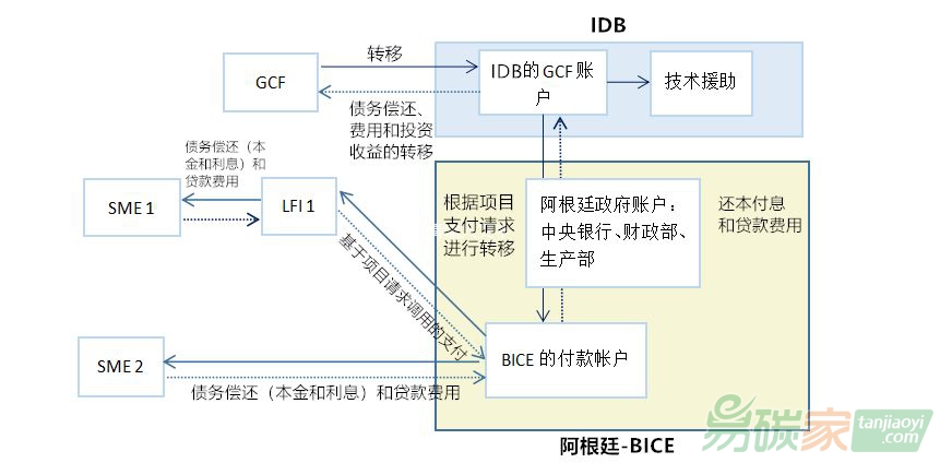 對于第二部分,GCF資金將轉(zhuǎn)移到阿根廷共和國,然后阿根廷共和國將資金轉(zhuǎn)移到BICE,以便BICE在專用的循環(huán)賬戶中管理和使用。BICE需要保持其共同融資水平,只有這樣才能利用GCF融資發(fā)放貸款,否則就要償還GCF提供的資金。