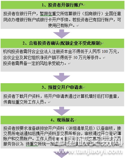(二)投資者應在重慶碳排放交易系統開立碳排放交易賬戶,用于碳排放交易。機構投資者應指定碳排放交易聯系人1名,交易系統相關事宜均聯系此人。投資者需在指定結算銀行——招商銀行開立人民幣結算賬戶,已在招商銀行開立基本賬戶或一般賬戶的企業無需再開立。