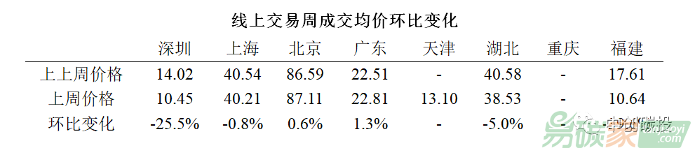 在連續兩周發生交易的區域市場中,福建市場的價格變動幅度較大,較前一周下跌了近40%;深圳市場價格跌幅超過25%。湖北成交均價較前一周略有回落;其他地區市場價格表現穩定,線上交易平均價格與前一周持平。