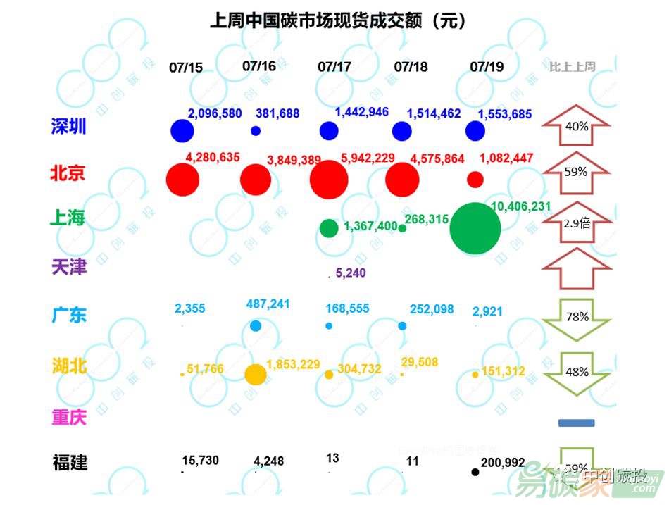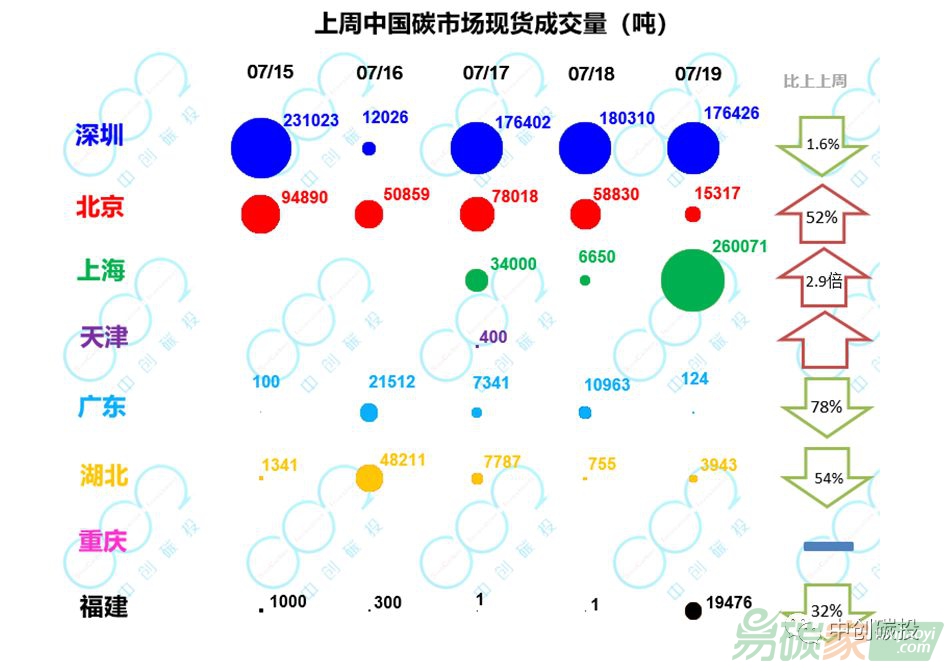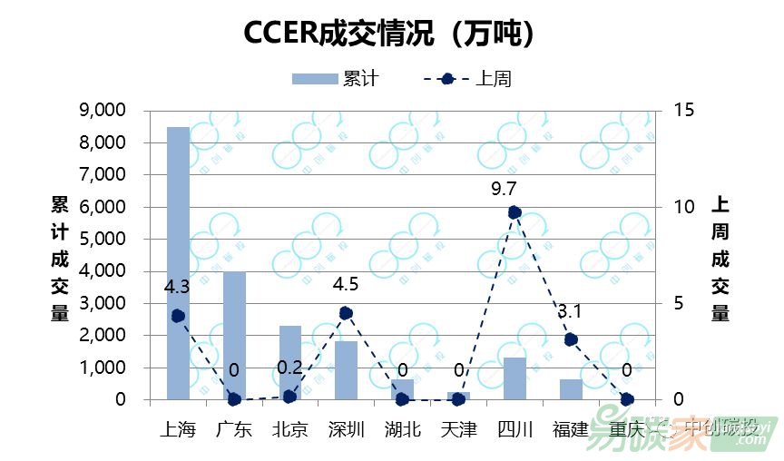 碳市場一、二級配額現貨市場共計成交149.8萬噸,與前一周(143.4萬噸)基本持平,其中深圳的貢獻最大,上周總成交量超過各試點交易總量的50%;總成交額4229.2萬元,均較前一周(3082.0萬元)上漲了37%。