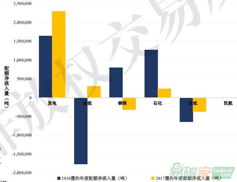 其他行業中,發電行業延續配額凈流入態勢,2018履約年度行業凈流入量較2017履約年度同比減少28.55%;石化行業2018履約年度行業凈流入量較2017履約年度同比增加440.07%;