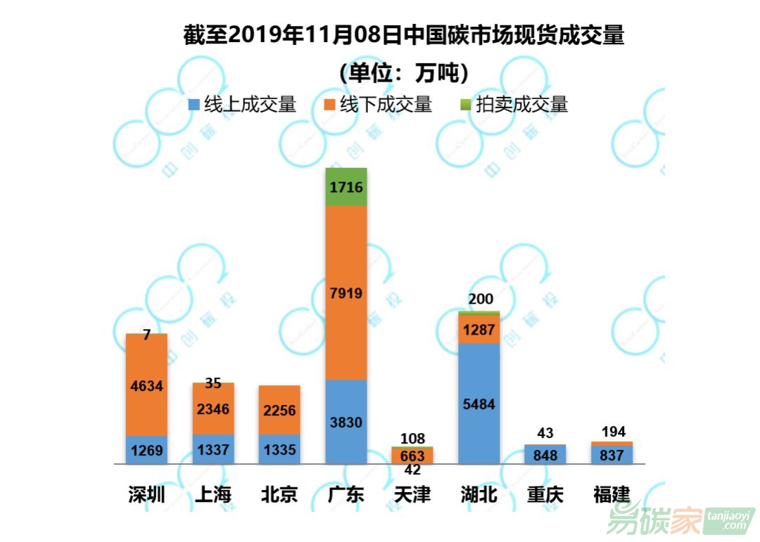 在累計成交方面,截至2019年11月8日,8個區域碳市場現貨累計成交3.64億噸,總成交額79.65億元。其中,廣東、湖北累計成交量與成交額最高,位于第一梯隊;深圳、上海、