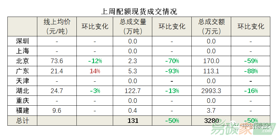深圳、上海、天津、重慶市場均無成交。上周,8個區域碳市場配額總成交量130萬噸,總成交額3280萬元,均較前一周(259萬噸,6566萬元)下跌了50%。