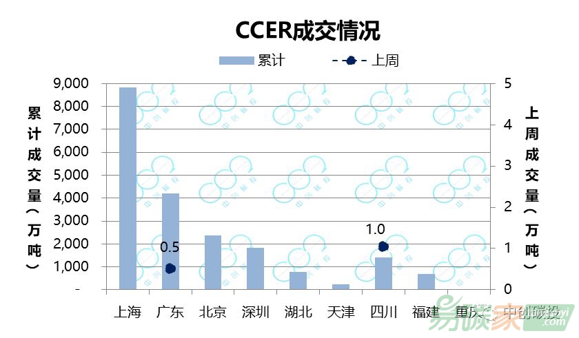 四川、廣東CCER市場發生交易,累計成交量分別為10496噸、5000噸。