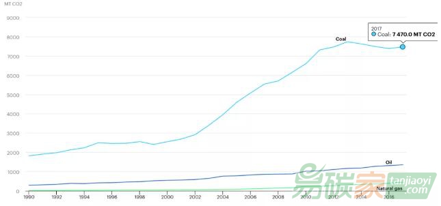 圖3:中國(guó)不同能源消費(fèi)所對(duì)應(yīng)的碳排放1990-2017