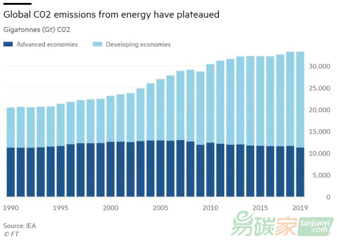 碳排放量在經(jīng)過(guò)兩年的增長(zhǎng)后,2019年排放量為330億噸左右,與上一年持平。這主要是由于發(fā)達(dá)經(jīng)濟(jì)體