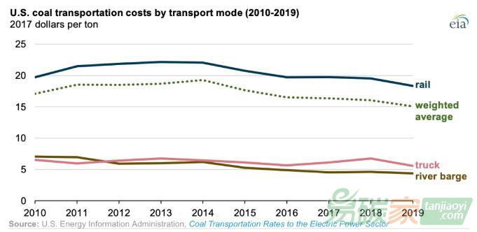 運輸成本穩步下降(以2017美元計算)。2019年煤炭平均運輸成本為15.03美元/噸(美制短噸,下同),低于2018年的16.07美元/噸。2019年運輸成本約占煤炭總交付成本的40%,比上年下降1%。在過去10年中,煤炭本身的生產成本的下降速度超過了運輸成本。因此,運輸在煤炭總交付成本中的份額有所增加。