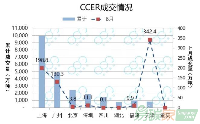 截至2020年6月30日,全國CCER累計成交2.3億噸。其中上海CCER累計成交量持續領跑,達9959萬噸,占比43%;廣東CCER累計成交4891萬噸,排名第二,占比21%;北京、深圳和