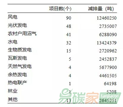 從項目類別看,已獲得減排量備案且材料公示的254個項目中,有第一類項目139個,合計備案減排量1890萬噸CO2e;第二類項目17個,備案減排量372萬噸CO2e;第三類項目98個,備案減排量3031萬噸CO2e。從項目類型看,風電、光伏、農村戶用沼氣、水電等項目較多,詳細情況如下圖所示: