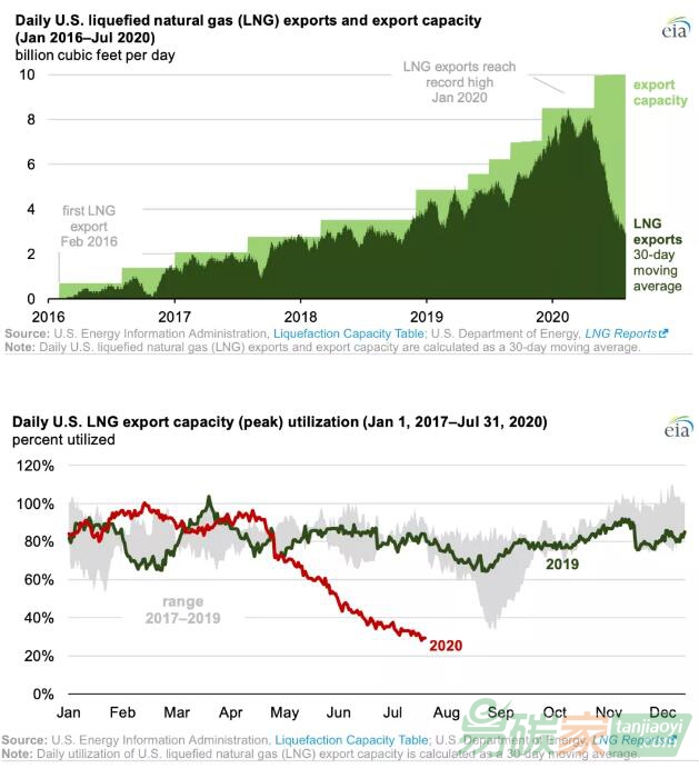 據美國能源信息署的數據,美國液化天然氣(LNG)在2020年1月創下80億立方英尺/天的創紀錄高位之后,2020年7月降至平均31億立方英尺/天,約為當前出口能力(100億立方英尺/天)的三分之一。
