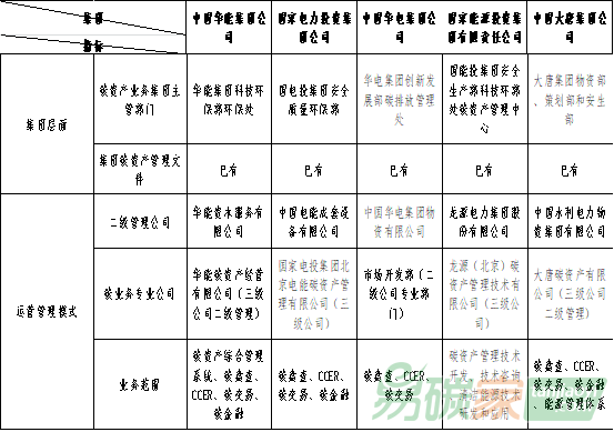 從2013年起,隨著中國(guó)碳市場(chǎng)開啟,電力行業(yè)是首先被納入控排的行業(yè)之一,大型發(fā)電企業(yè)開始逐步關(guān)注并且重視國(guó)內(nèi)碳市場(chǎng),積極建立碳資產(chǎn)管理組織體系和建章立制,目前大型電力企業(yè)在集團(tuán)層面上已基本確定了碳資產(chǎn)業(yè)務(wù)集團(tuán)主管部門及集團(tuán)碳資產(chǎn)管理文件,同時(shí),電力企業(yè)可以建立專門的碳資產(chǎn)管理機(jī)構(gòu),統(tǒng)一管理企業(yè)的碳資產(chǎn),積極應(yīng)對(duì)全國(guó)統(tǒng)一碳市場(chǎng)。五大電力碳資產(chǎn)組織指責(zé)及運(yùn)營(yíng)管理模式如下表所示: