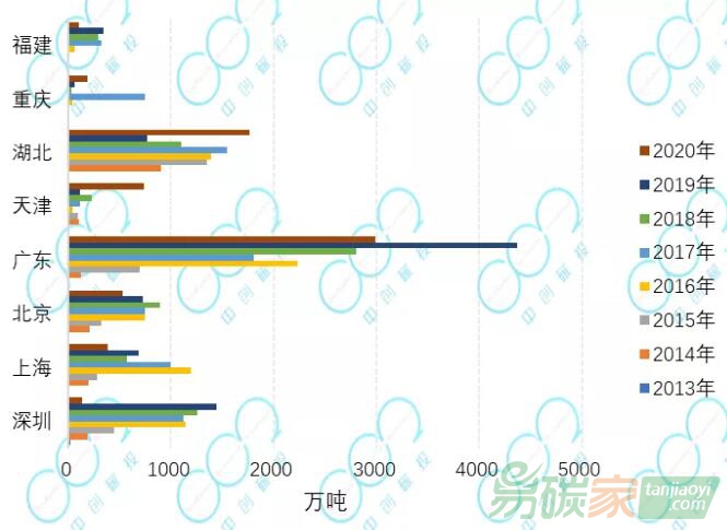 (注:CCER成交情況數據來源:上海、廣東、深圳、天津、四川的信息來自各自交易所的官方網站或官方微信公眾號,北京、湖北、福建、重慶的信息來自廣州