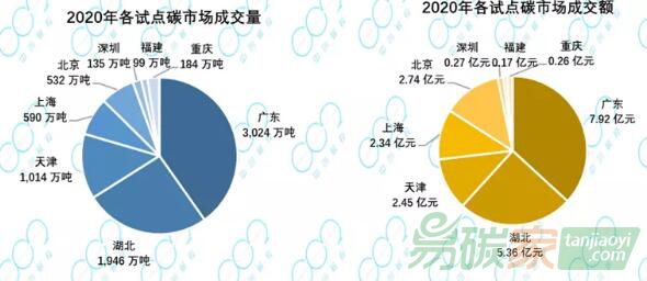 2020年,八個試點碳市場共成交配額7525萬噸,其中廣東市場配額成交最為活躍,成交配額3024萬噸;湖北碳市場次之,成交1946萬噸;天津市場活躍度顯著提升,成交1014萬噸;上海與