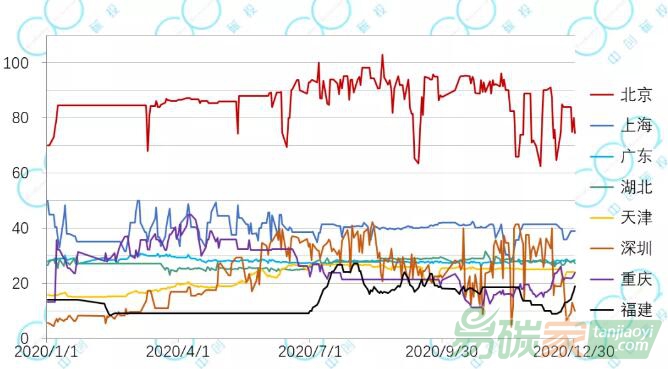 深圳碳市場2020年不同品種配額價格出現較大差異;
