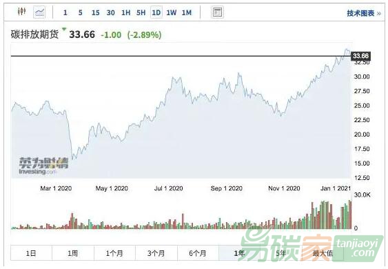 洲際交易所碳排放期貨在去年12月時就漲至32.08歐元一噸,相當于39.08美元一噸,創下歷史新高。而進入1月,繼續上漲,截至今日(14日)午間,報33.66歐元/噸,再創新高。