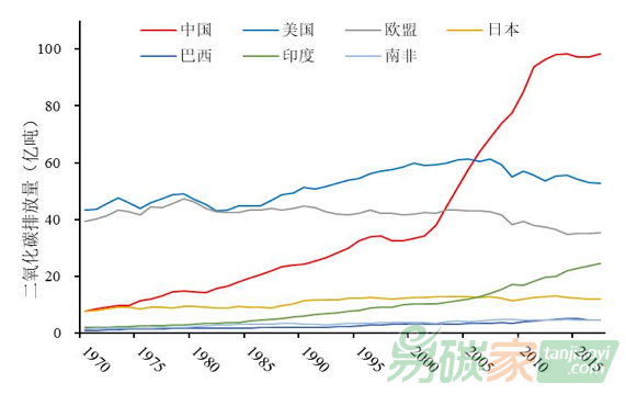 圖1 世界主要國(guó)家二氧化碳排放總量圖(數(shù)據(jù)來(lái)源:GCP)