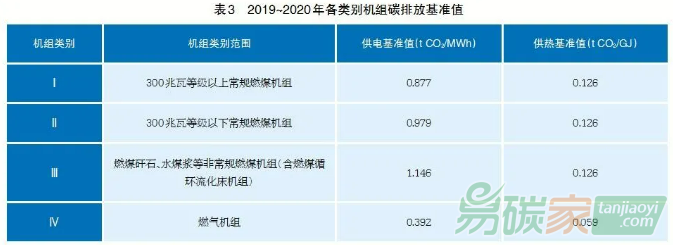 納入2019~2020年配額管理的發電機組包括300兆瓦等級以上常規燃煤機組,300兆瓦等級及以下常規燃煤機組,燃煤矸石、煤泥、水煤漿等非常規燃煤機組(含燃煤循環流化床機組)和燃氣機組四個類別。2019~2020年各類別機組碳排放基準值見表3,其他規定詳見《實施方案》。