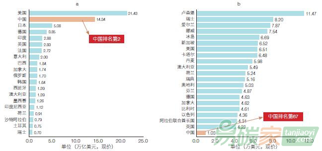 圖2 2019 年全球GDP(a)及人均GDP(b)排名前20 位的國家