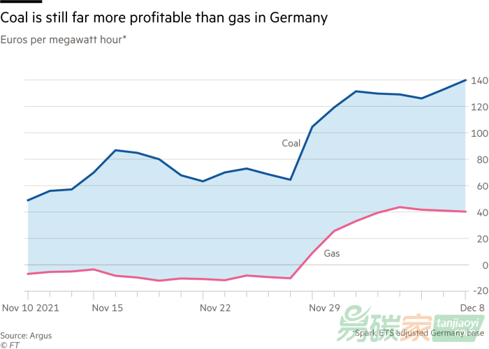 據追蹤商品價格的公司阿格斯媒體稱,11 月法國、德國、西班牙和英國的燃煤發(fā)電量達到近 8 太瓦時,為 2019 年 11 月以來的最高水平。這些數字不包括德國燃燒褐煤產生的 9.6 太瓦時電力,褐煤是一種國內生產的低質量煤炭。