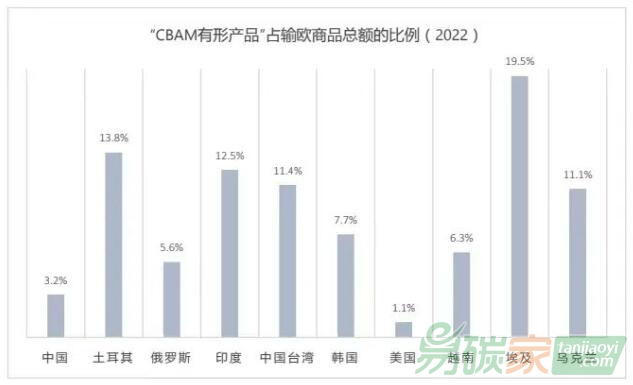 雖然199.6億歐元這一絕對數字不小,但也應注意到2022年歐盟從中國進口的商品總額為6,260億歐元,其中“CBAM有形產品”占比僅為3.2%。這個比例在排名前十的國家和地區中是第二低,略高于美國(1.1%),遠低于埃及(19.5%)、土耳其(13.8%)和印度(12.5%)。這說明中國對歐出口的主力并非CBAM所覆蓋的初級原材料產品及其直接