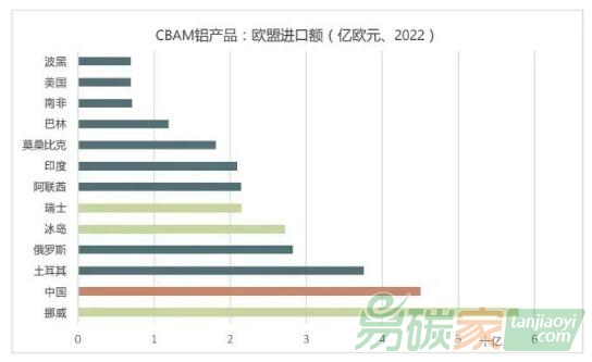 2022年,以貿易額計,歐盟進口的“CBAM鋁產品”主要來自:挪威、中國、土耳其、俄羅斯、冰島、瑞士、阿聯酋、印度、莫桑比克、巴林、南非、美國和波黑。在上述13個國家中,挪威、瑞士和冰島因豁免于CBAM應予排除,剩下的就是歐盟進口“CBAM鋁產品”的十大來源。中國仍然排名第一,為45億歐元,占歐盟從中國進口總額的0.7%。