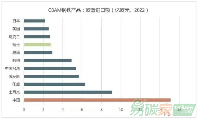 臺灣、韓國、越南、瑞士、烏克蘭、美國和日本。在上述11個國家和地區中,瑞士因豁免于CBAM應予排除,剩下的就是歐盟進口 “CBAM鋼鐵產品”的十大來源。中國排名第一,為151億歐元,占歐盟從中國進口總額的2.4%。