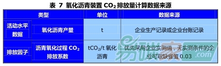 ECO2_瀝青(tCO2)=活動水平數(shù)據(jù)(t)*排放因子(tCO2/t)=氧化瀝青產(chǎn)量(t)*瀝青氧化過程的CO2排放系數(shù)(tCO2/t氧化瀝青)