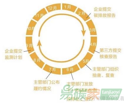 在交易啟動以后,政府應督促企業和第三方機構建立一個常規的報送核查流程,保障碳排放數據的真實有效。碳交易流程如圖 所示,其中報送核查工作占了很大比重(圖中時間節點僅為舉例,實際以政府公文為準):